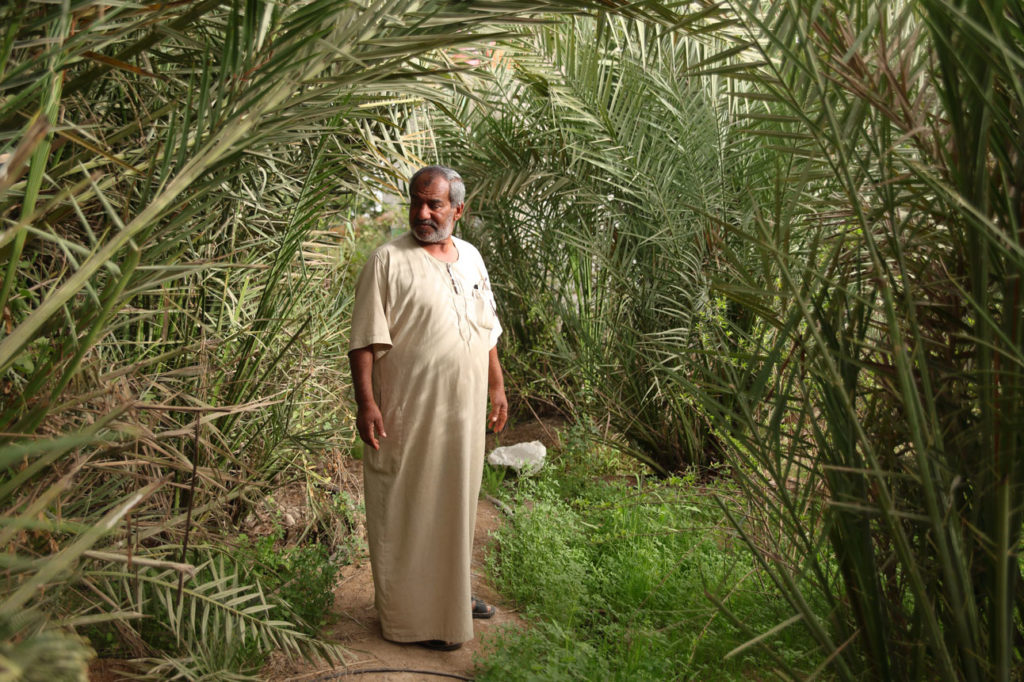 Palm branches whip back as Hussein Ibrahim walks through his densely planted land in Al Fao, the very last village in Iraq’s south as it reaches the Persian Gulf. Affectionately known as Abu Yusuf in reference to his eldest son, Ibrahim explains that farming is his culture.